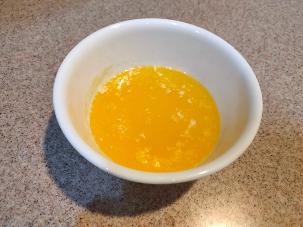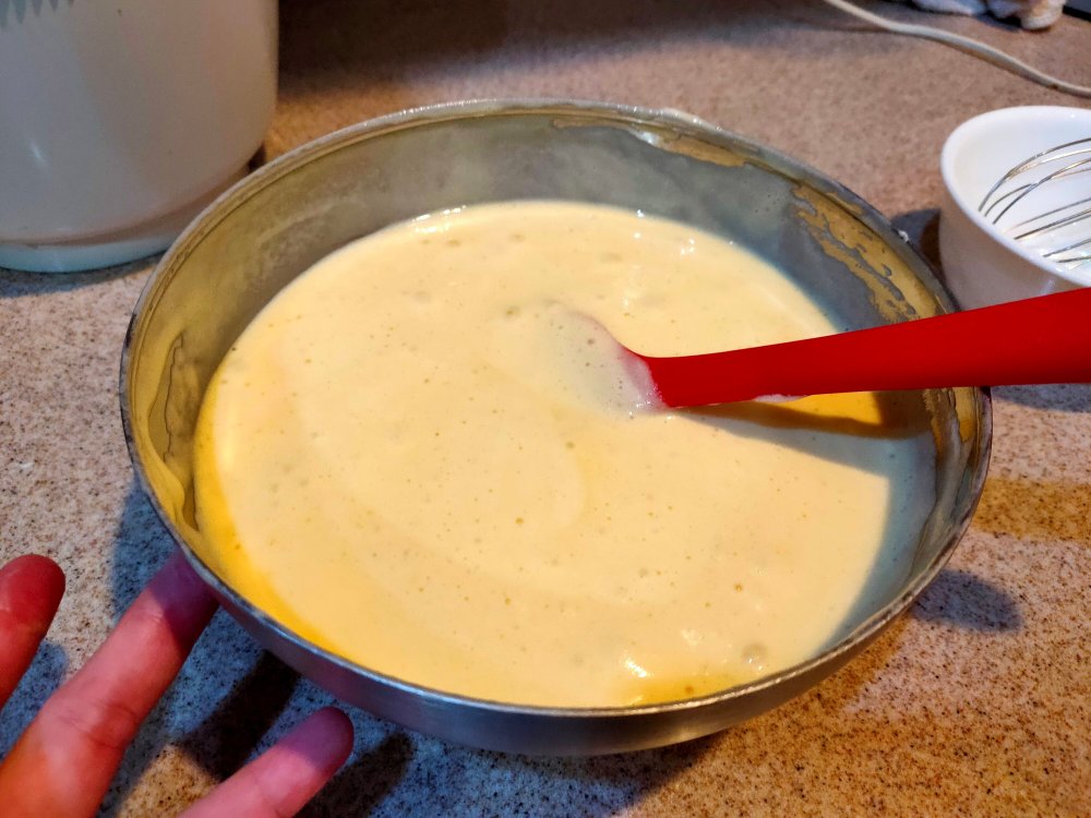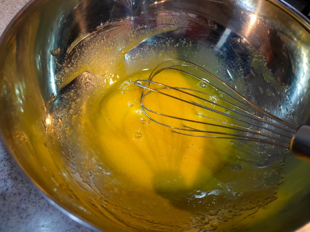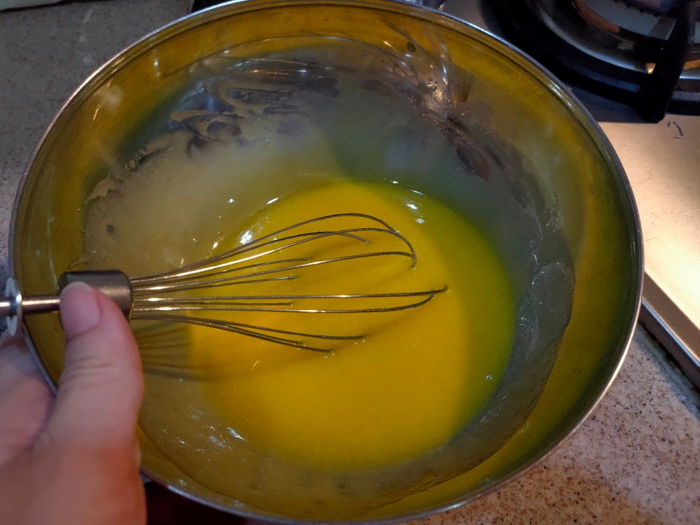2. Then pour cooled melted butter slowly in a stream while stirring at the same time to ensure proper emulsification (you shouldn’t see separation).