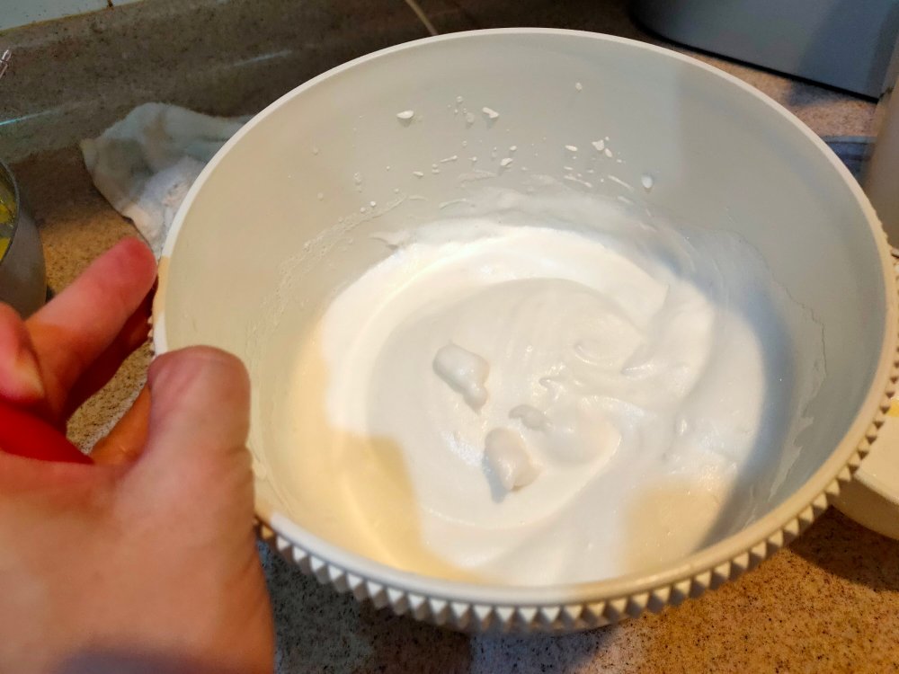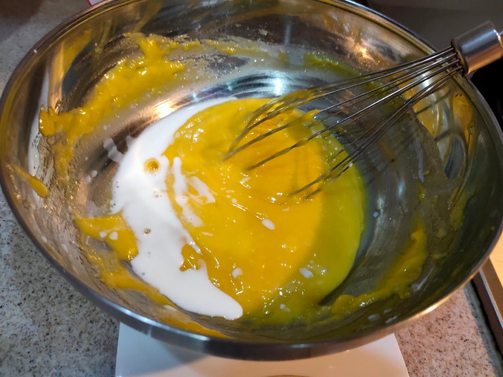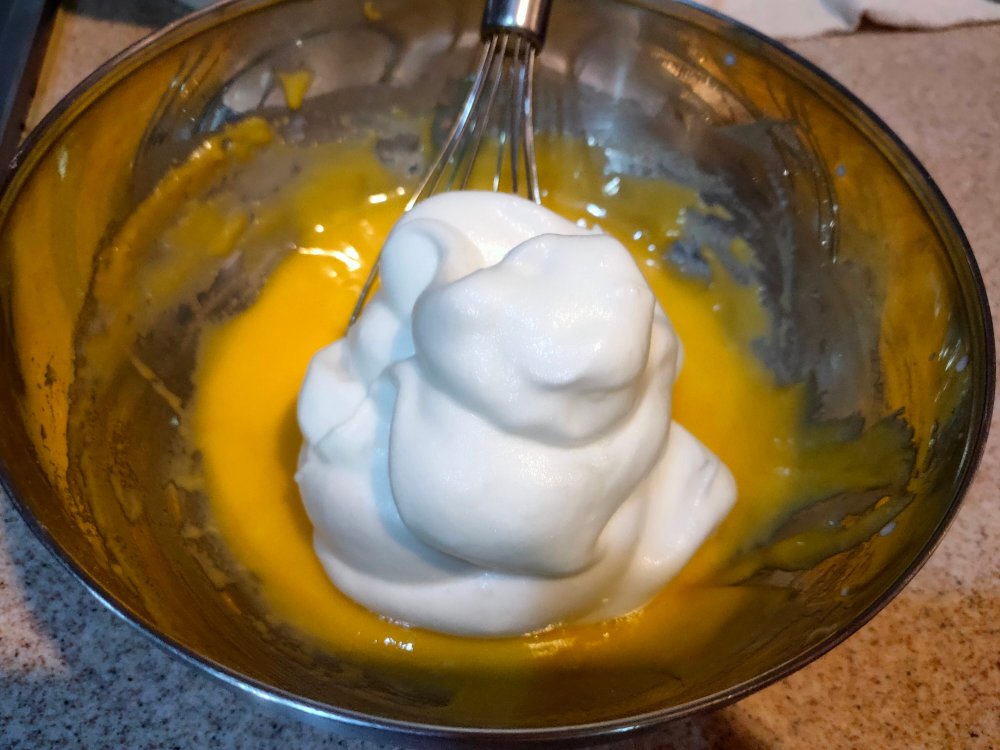 6. Transfer 1/3 of meringue to yolk mixture and mix to loosen. Then pour all of yolk mixture into remaining meringue and fold gently till no white is visible.