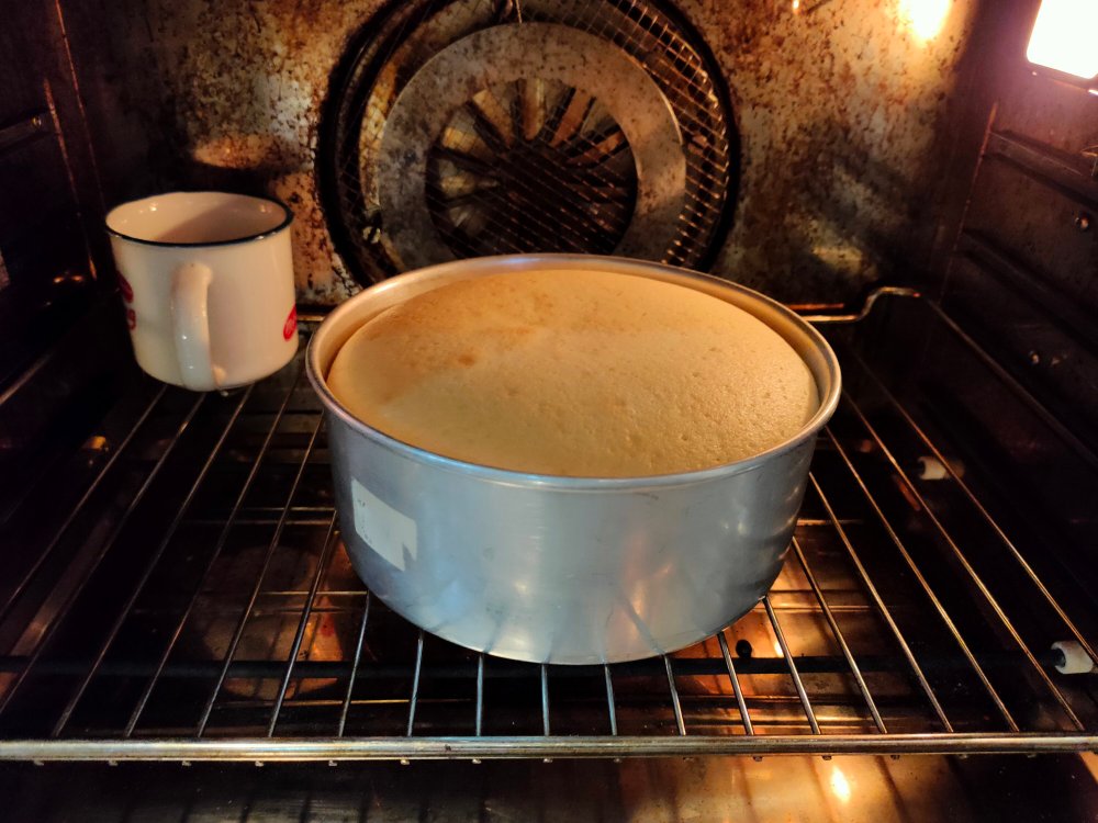 7. Pour into an unlined, loose bottom cake tin. Bake at lower rack 180 deg C for 35min till golden and skewer comes out clean. I like to preheat with top and bottom heat. Once I place the cake tin in, I use bottom heat only. Then at the last 5 min, I switch to top and bottom to ensure a golden brown. This method avoids cracks.