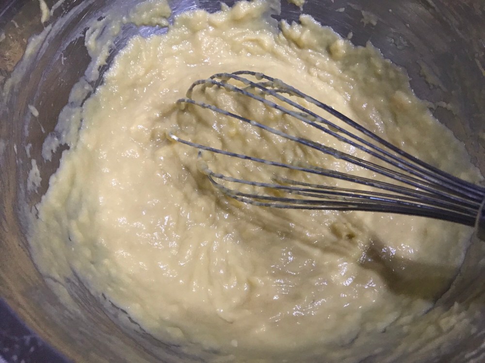 2. In a mixing bowl, whisk durian mousse with milk till well combined. You can add milk by tbsp if you feel the puree is too dry.