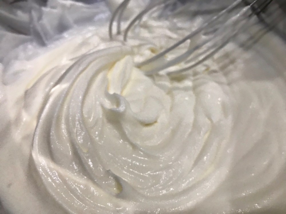 3. In a separate bowl (and you should place an ice pack underneath), whipped the cream with the icing sugar till soft peak.