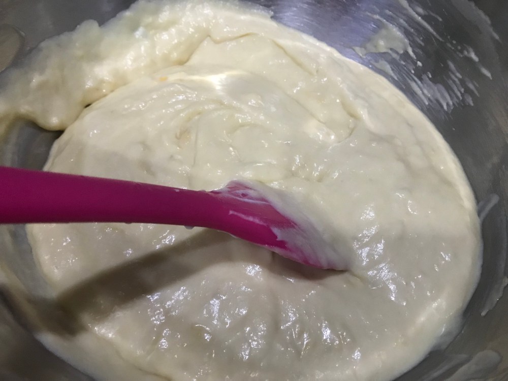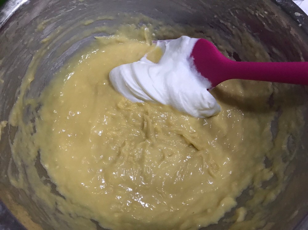 4. Now add the cooled gelatin into the durian puree and hand whisk quickly so it does not coagulate at one spot. Next fold in the whipped cream gently.