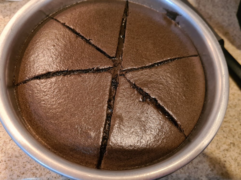 7. Bake at preheated oven at 180 deg C top and 90 deg C bottom heat. At 6th minute when there is a skin formed, remove from oven and make a few cuts with knife, wiping the knife with each cut. Work quickly.