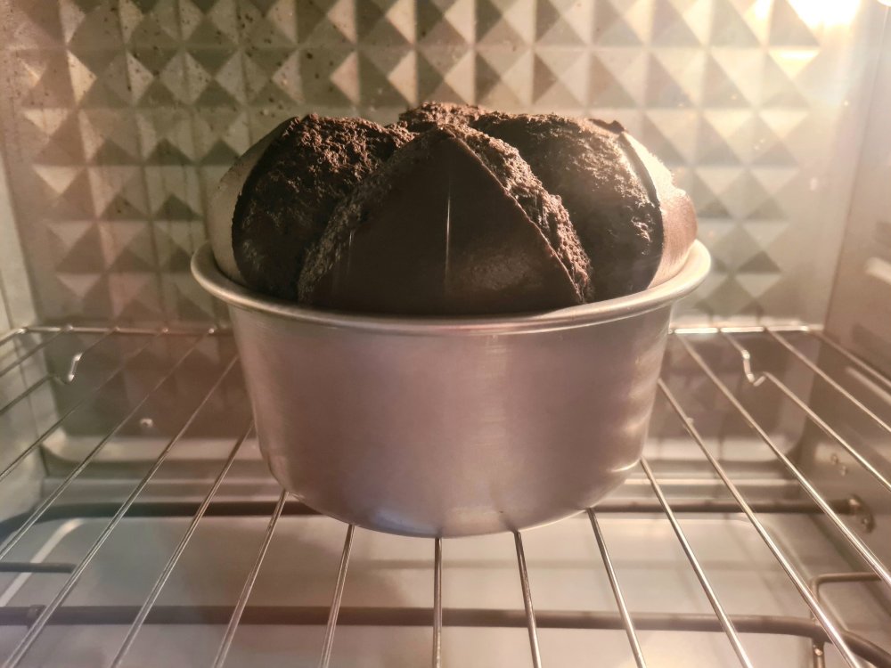 8. Continue baking for another 34 min till cook, check with skewer. Invert to cool, then hand unmould.