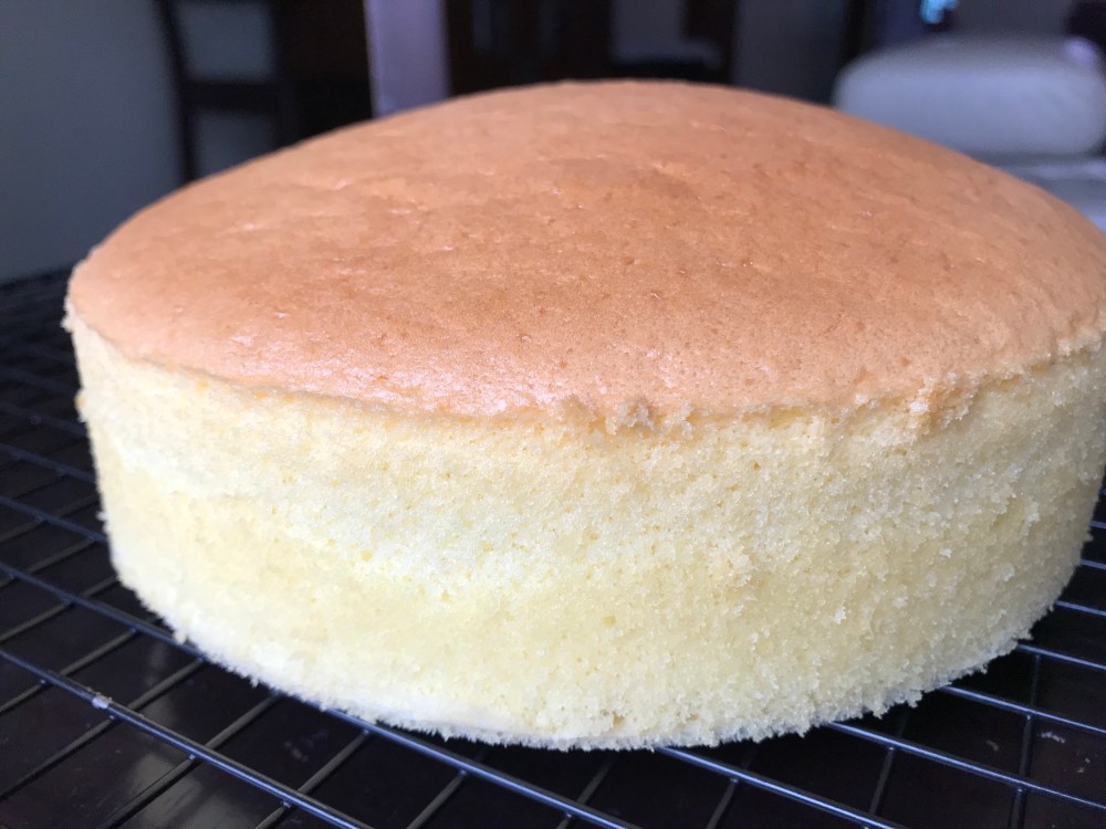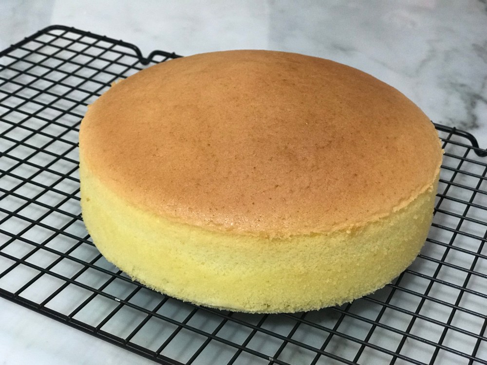 1. Bake a sponge cake from this link. Increase the recipe by 1.3 times (use 4 eggs), bake in a 7″ round cake tin at the same temperature and time.