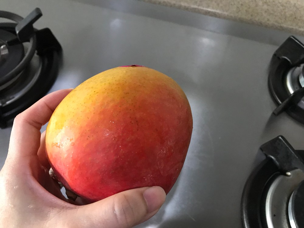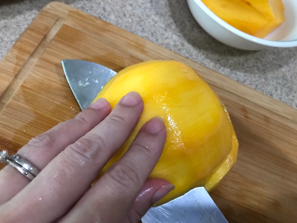 1. I used about one and a half Australia Calypso mango which are about 500g each in total. Peel and then cut as close to the pit as possible.