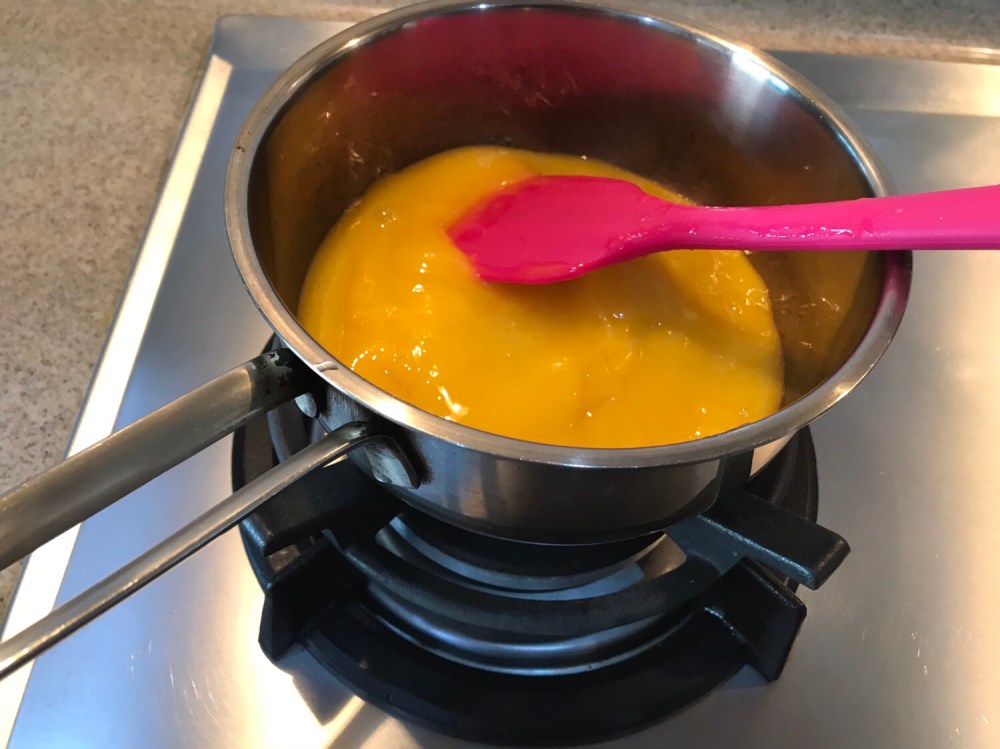 4. Place puree in pot and heat gently. Add in dissolved gelatin and hand whisk quickly to prevent the gelatin from forming clumps. Continue heating gently and stir till all the gelatin has dissolved. You can taste to see if more sugar is needed. Set aside to cool.