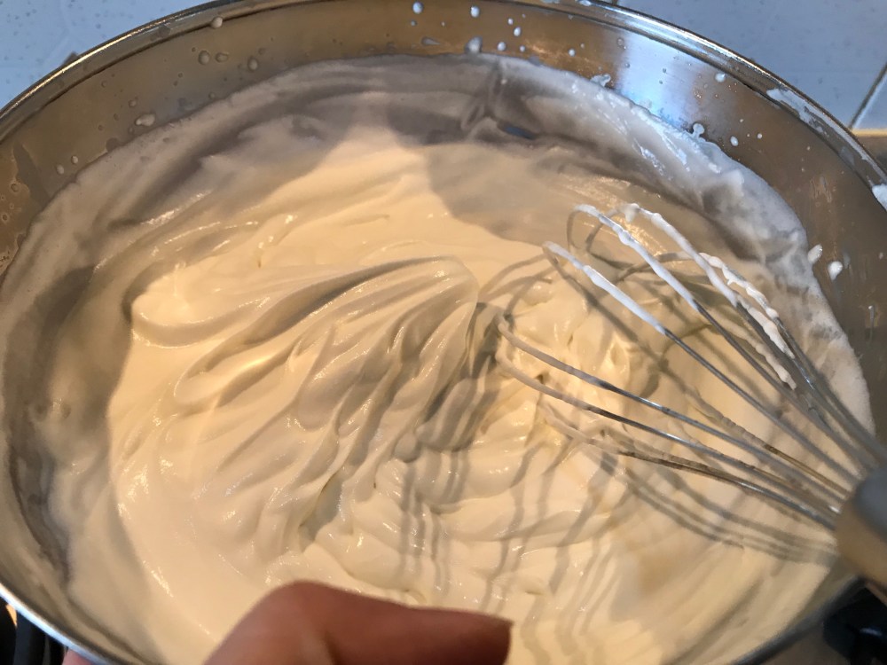5. Whipped the whipping cream with icing sugar. Be very careful not to over whip or it will curdle.