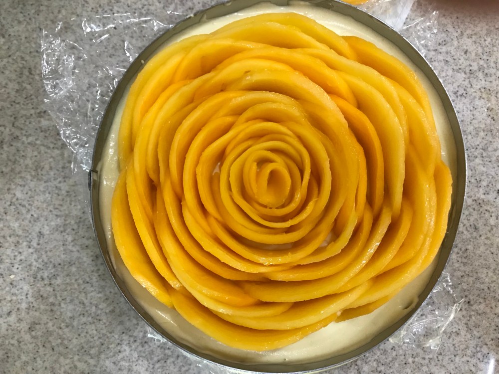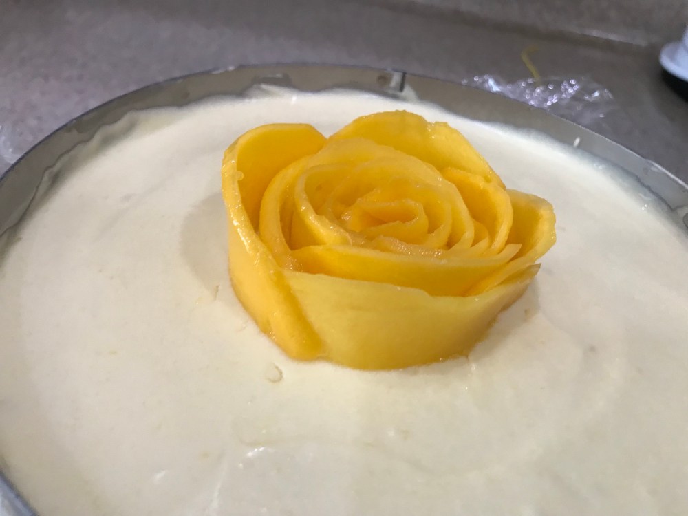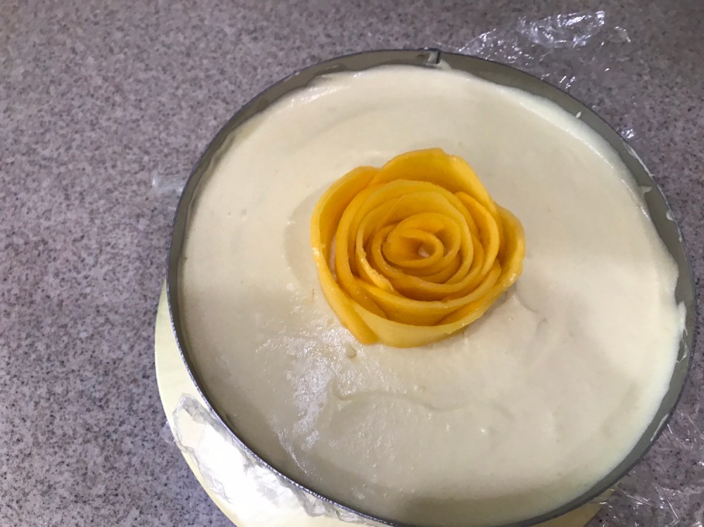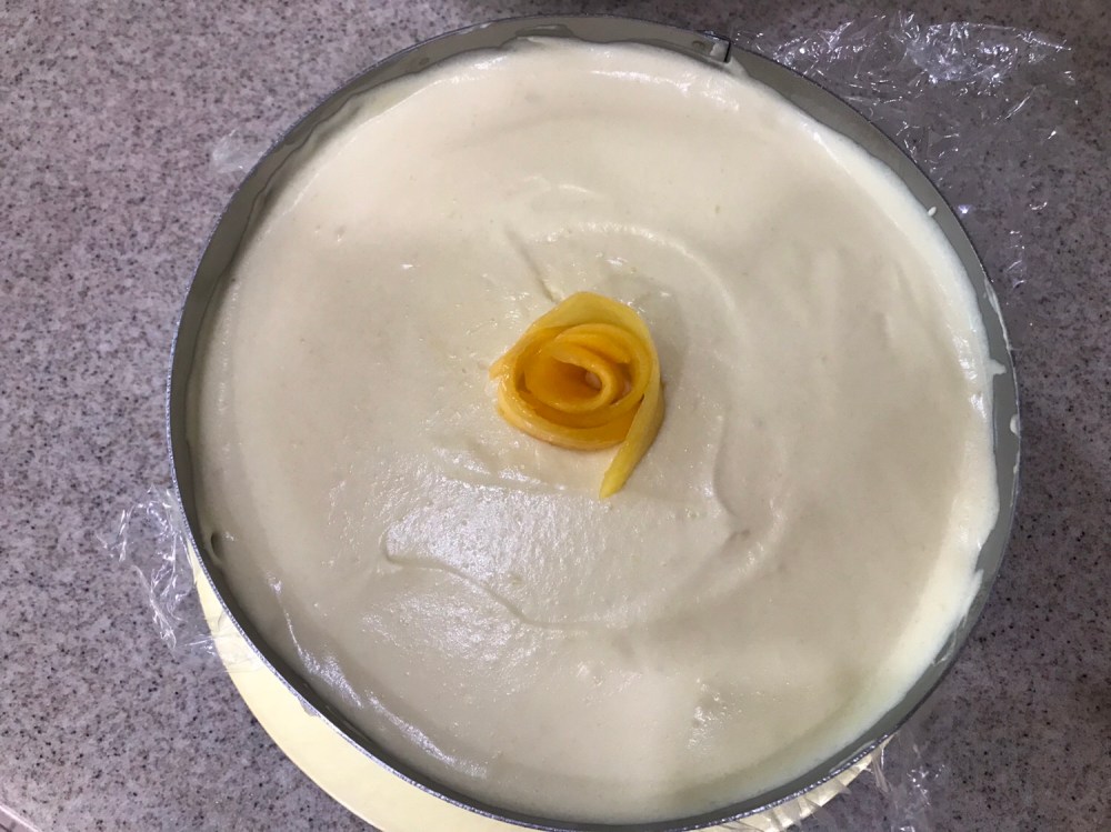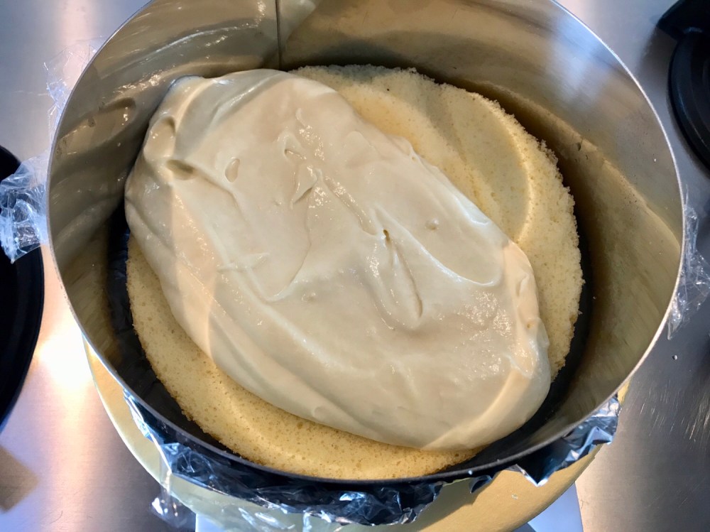 9. Now we can assemble. Place one layer of cake then pour about 300g of mousse in. Spread and make sure the mousse gets into the gap between the cake and the tin.