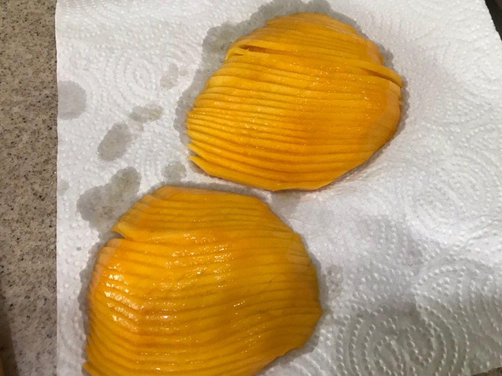 3. After a few minutes, take out the mango and slice thinly, then place on a kitchen towel.