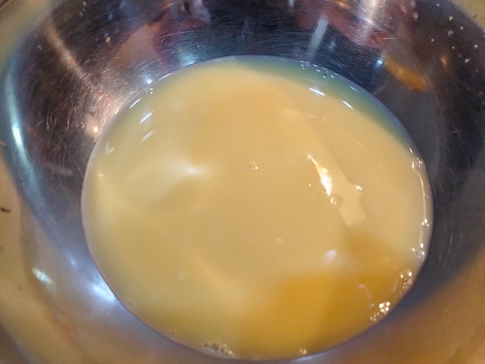 4. Add in stock. I used Swanson which already has salt. You can use Japanese stock too. STIR some more, avoid beating.