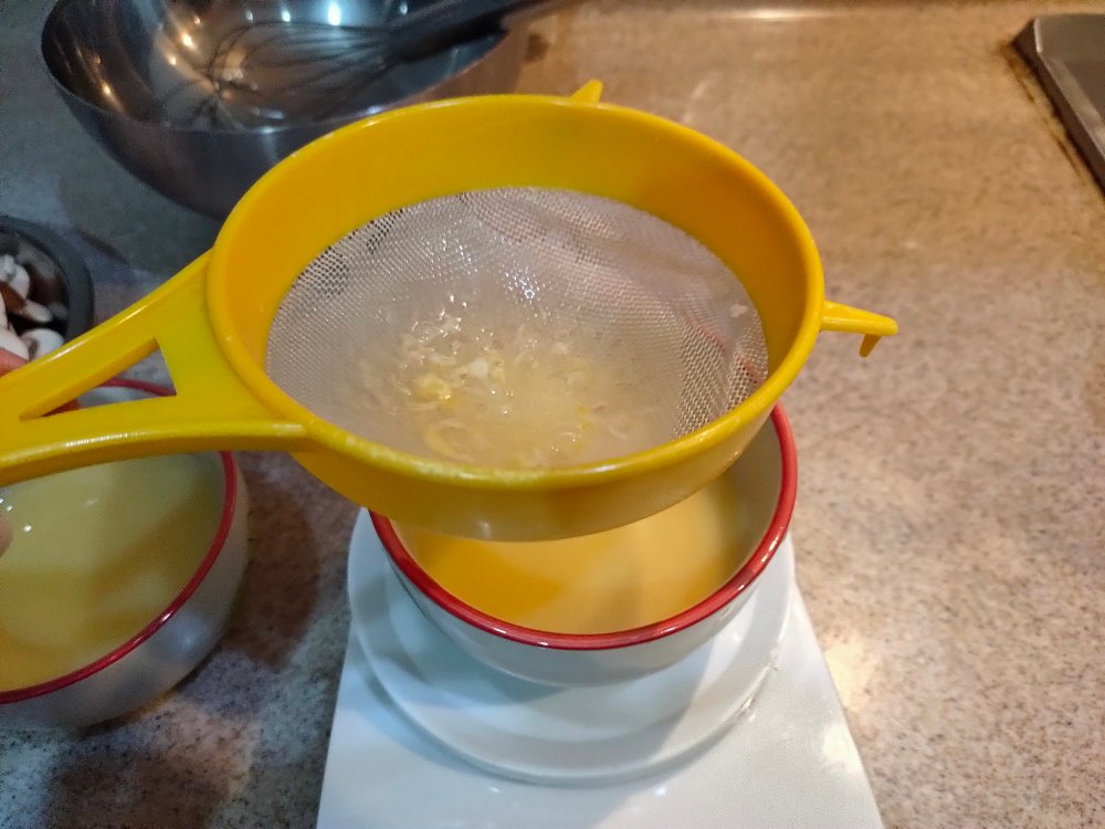 5. This is the most important step, SIEVE the egg mixture once. There will be some egg white bits collected, don’t force it through the sieve.