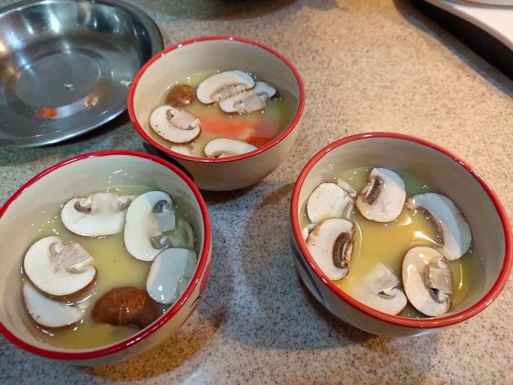 7. Place bowls into pot for steaming. Turn heat to high till water boils then turn to very low heat. Steam for about 13-15 min. You may need to adjust time based on your pot, number of bowls etc.