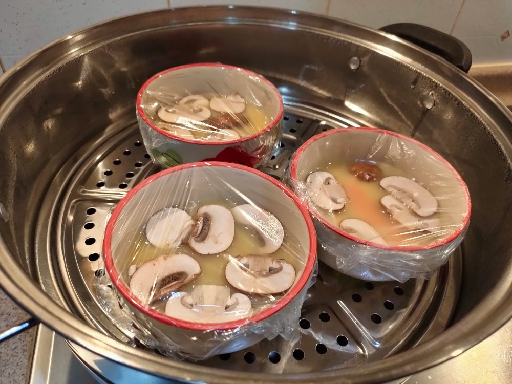 6. Place ingredients and egg mixture into bowls. Cover with steaming-safe cling wrap. If you have a proper chawanmushi container with cover, then skip the cling wrap.