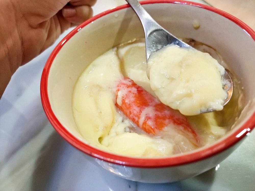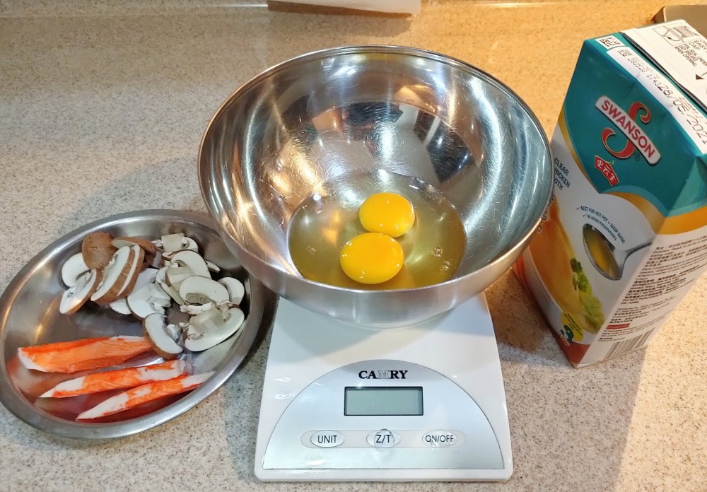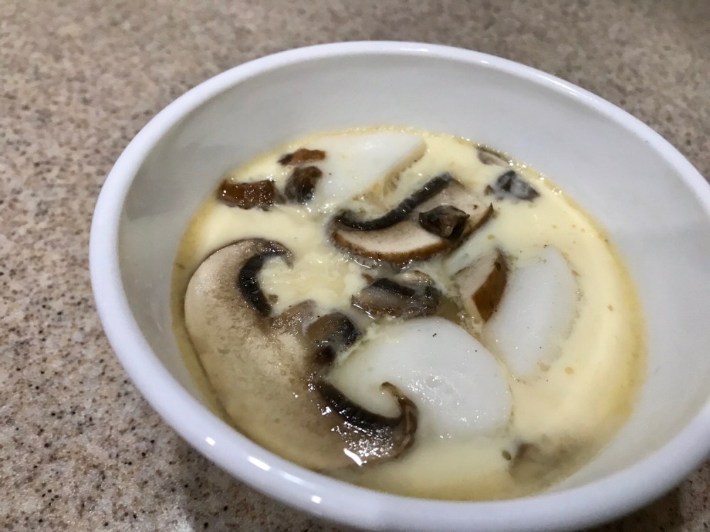 2. Prepare additional ingredients by cutting them up. Don’t use too much, 1 crab stick, few thinly sliced mushroom will do. Or just do without and just enjoy the silky egg pudding.