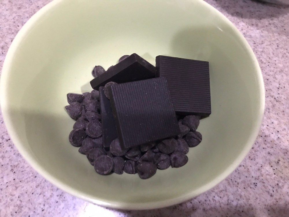 - 75g chocolate (I use 25g 80% dark chocolate with 50g Hershey minis)