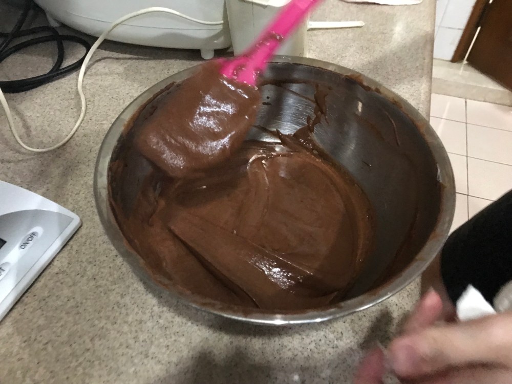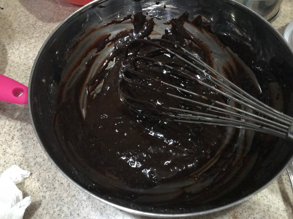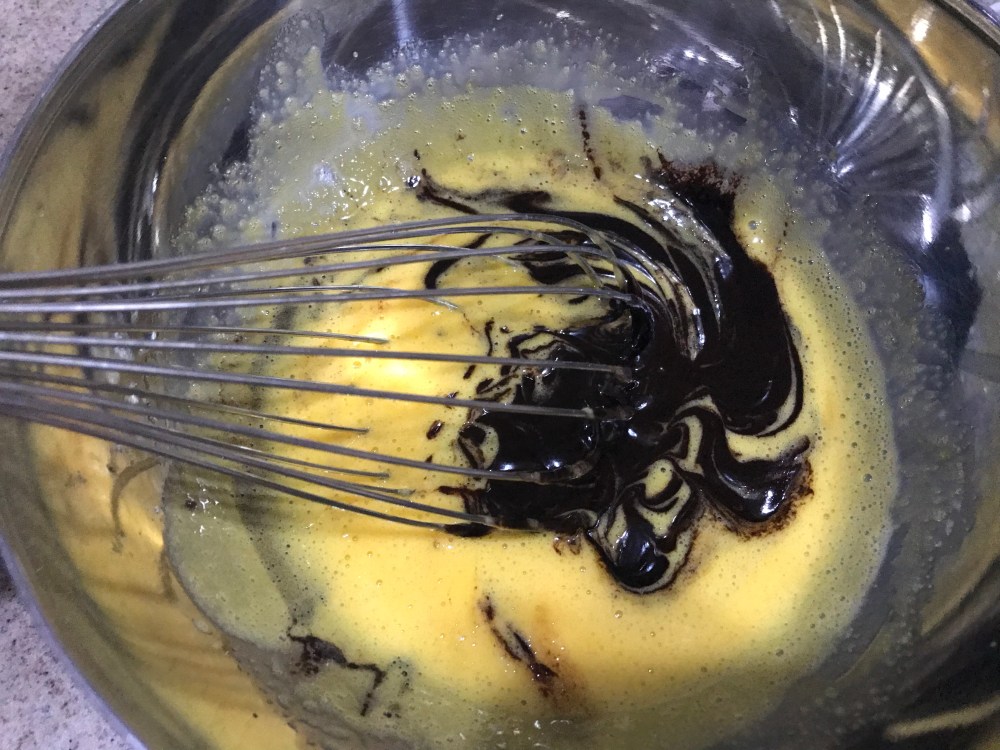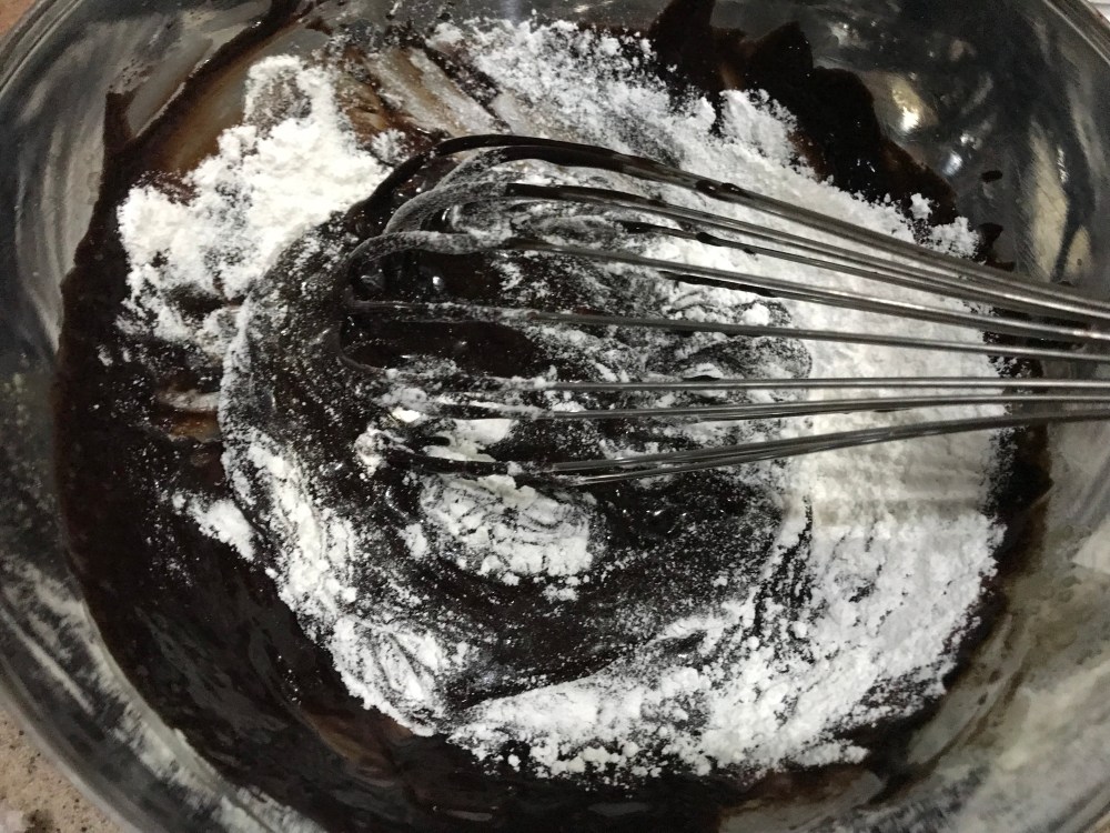 4. Add in the cooled chocolate. Mix well, then add in the cocoa mixture.