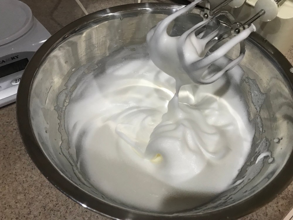 6. Beat egg whites, add 40g sugar in 2 steps till a firm meringue.