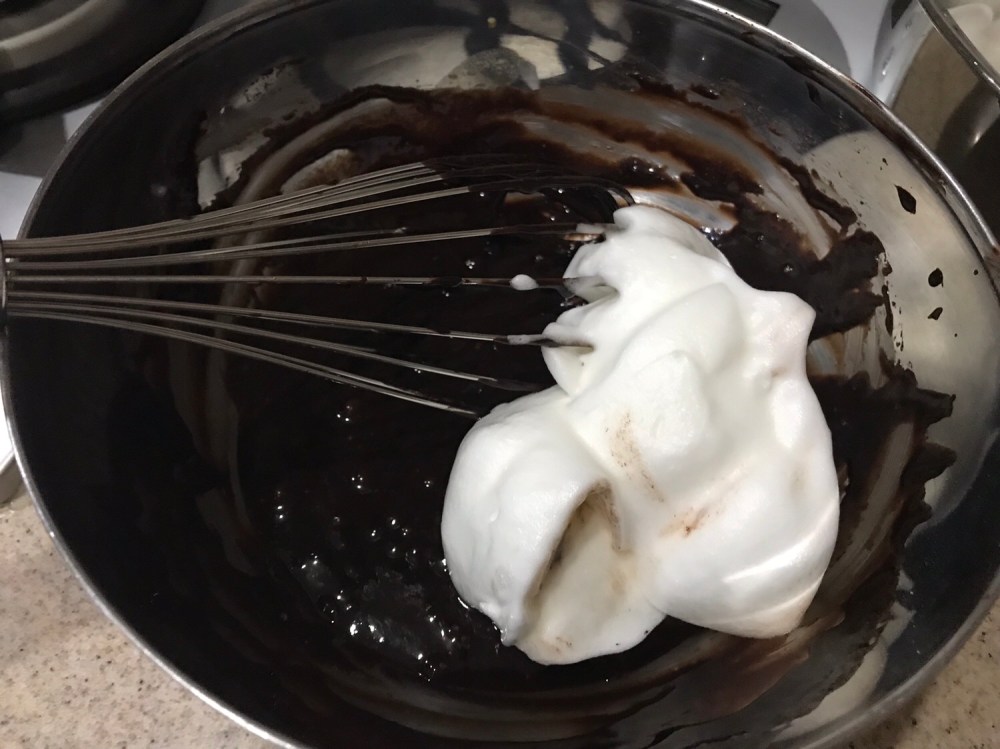 The cake rose very high on the strength of the meringue alone, with no other raising agent. Remember to use good chocolate and cocoa powder.