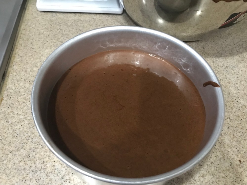 8. Pour into cake tin that is lined at the bottom only. Tap to release bubbles.