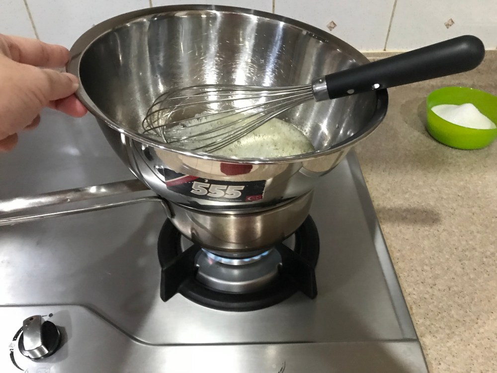 3. Mix constantly till all the sugar has melted in about a few minutes. Check with fingers. The mixture should be hot but not scorching (or the eggs will be cooked).