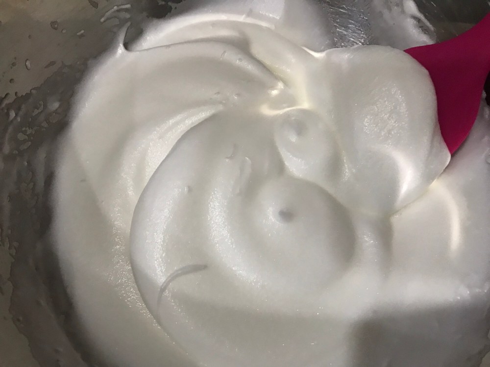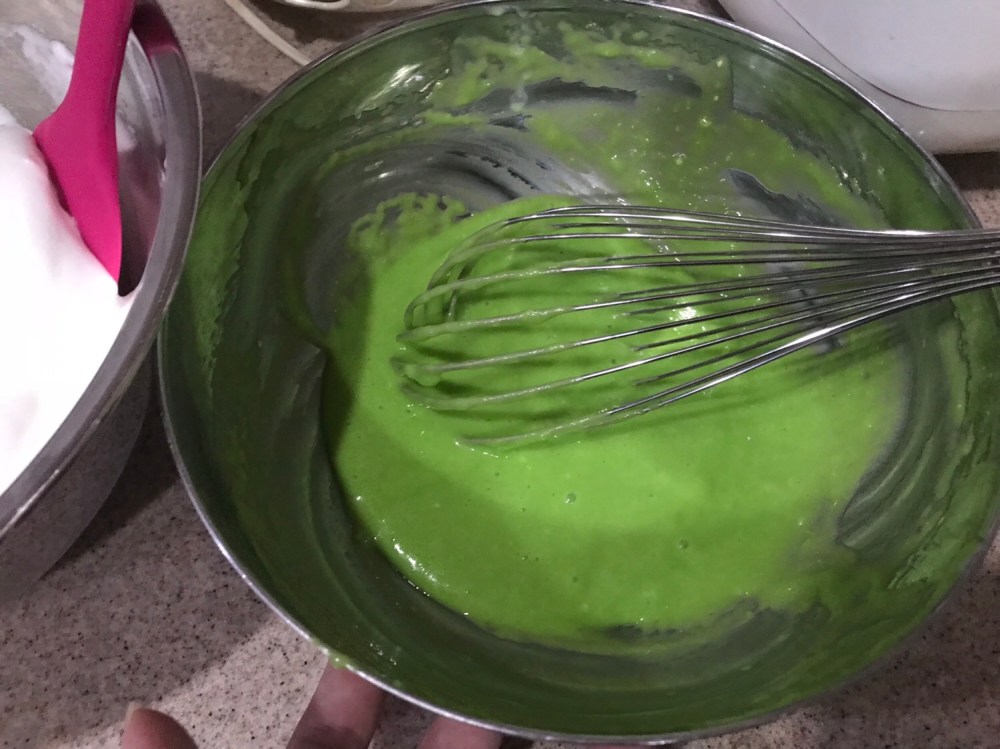 6. Add 1/3 meringue into yolk batter and mix with hand whisk. Then add yolk batter back to meringue and fold with spatula till no traces of white.