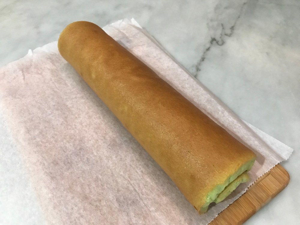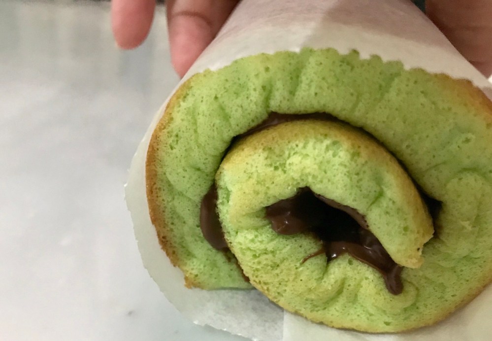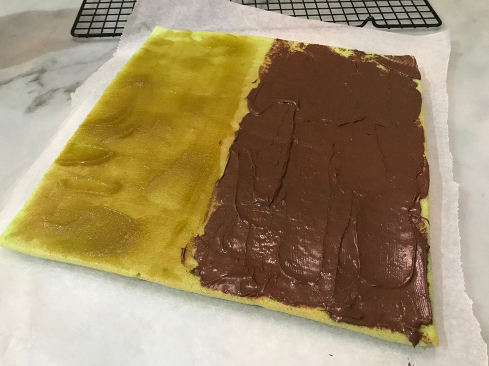 11. After cake has cooled, spread with jam of your choice. I did a combo here of kaya and Nutella. Whipped cream with some kaya added to become kaya chantilly cream works very well too.