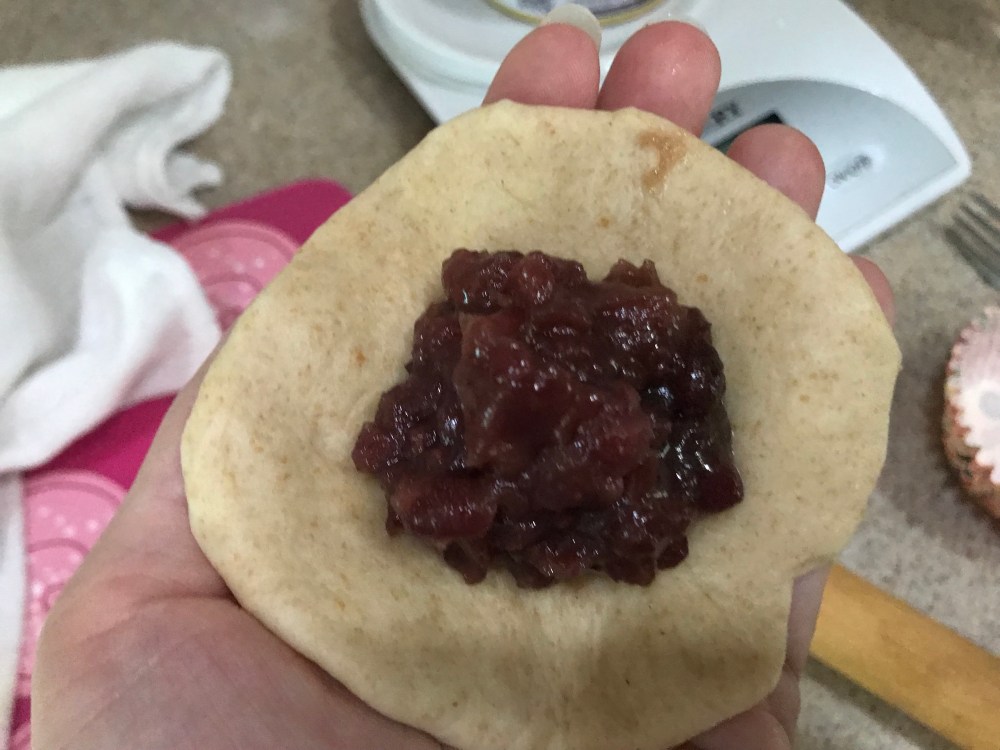 5. Roll out a dough. Place 25g bean paste in the centre and pinch to seal. Place on a baking paper.
