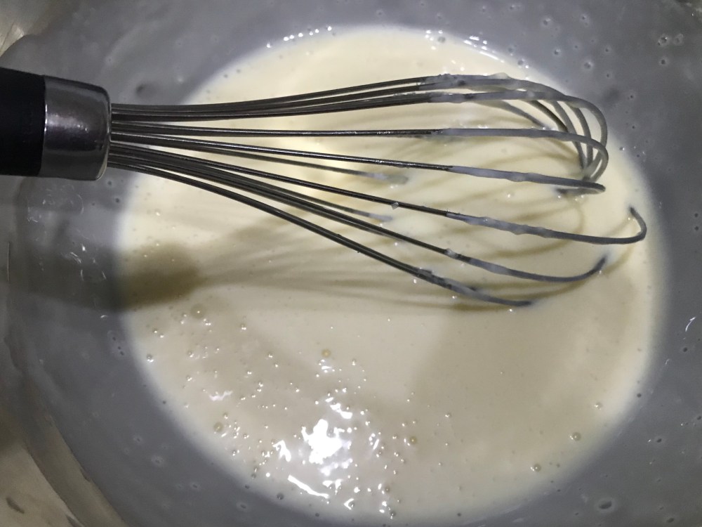 11. Next, heat up the milk till hot and pour over the gelatin powder. Stand for 3 mins. Then stir still all the gelatin has dissolved. Please do this step patiently as it will take time for the gelatin to fully dissolve. This took me another 5 mins and the milk has also cooled a bit.