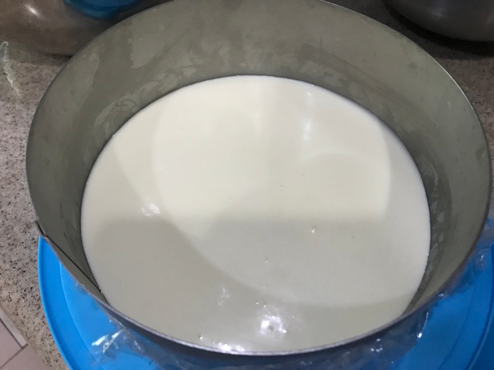 16. Place in the fridge overnight to set. When removing from cake ring, run a hair dryer around the ring and it should slide out.