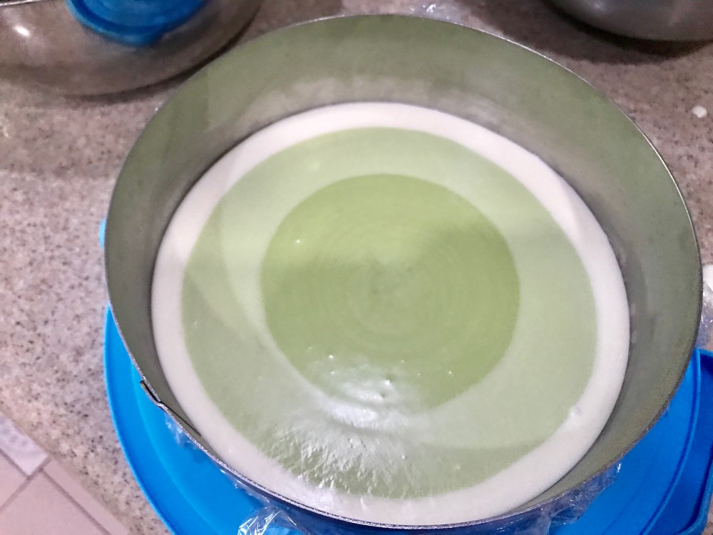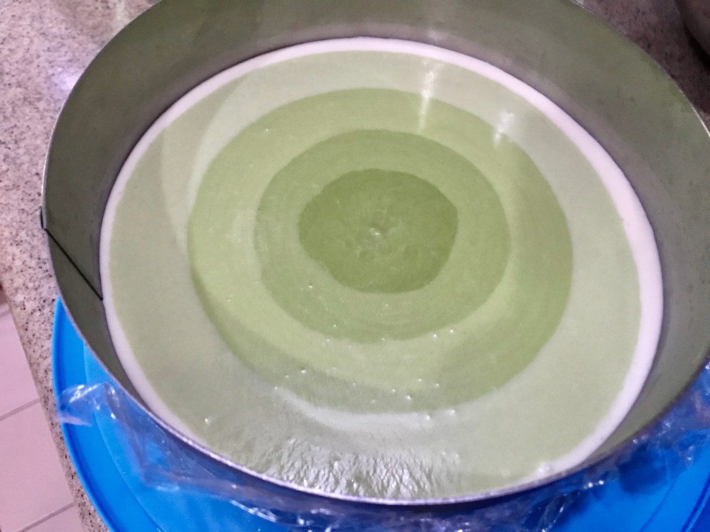 14. Continue to add the rest of the cream cheese mixture. Once all has been mixed evenly, pour this mousse paste into the bowls of matcha paste according to the below and mix till even.