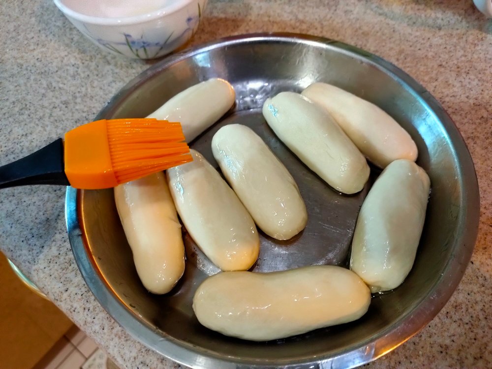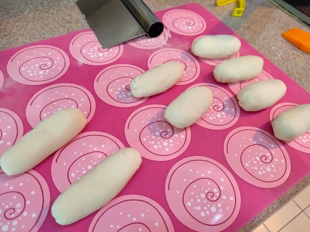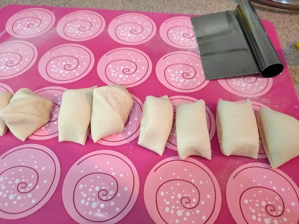 2. Divide dough into 8 portions, knead and roll to a long shape.
