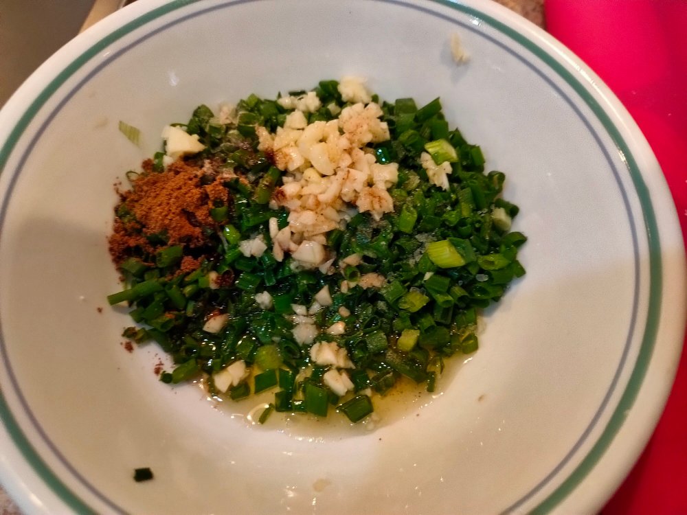 4. Mix all spring onion ingredients in a bowl except the oil. Heat oil and pour over spring onion, mix well.