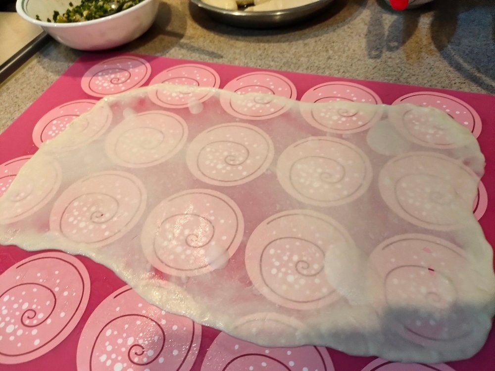 5. After resting, roll out a dough on an oiled mat. Use hands to gently stretch in all directions, till as thin and possible.