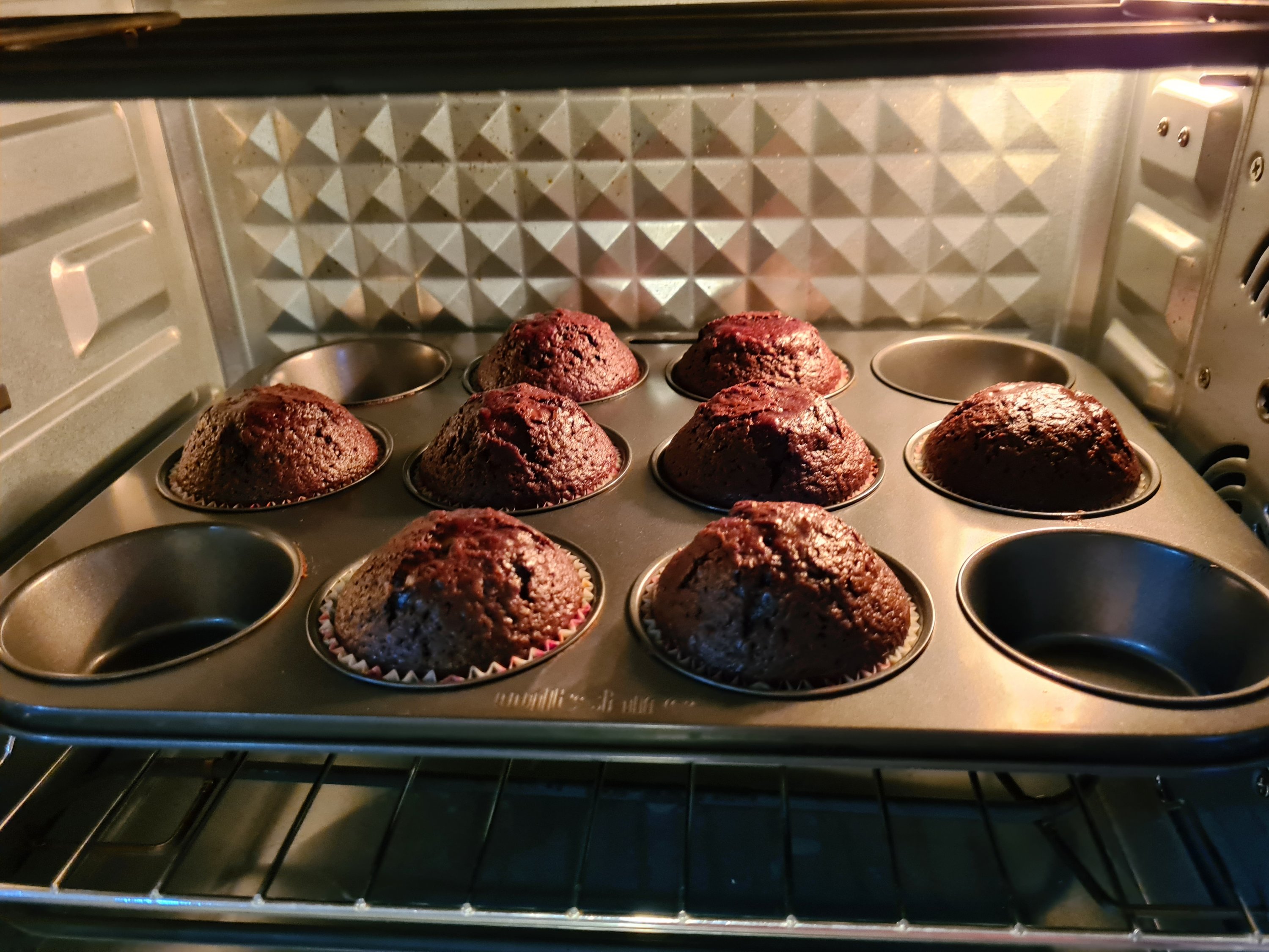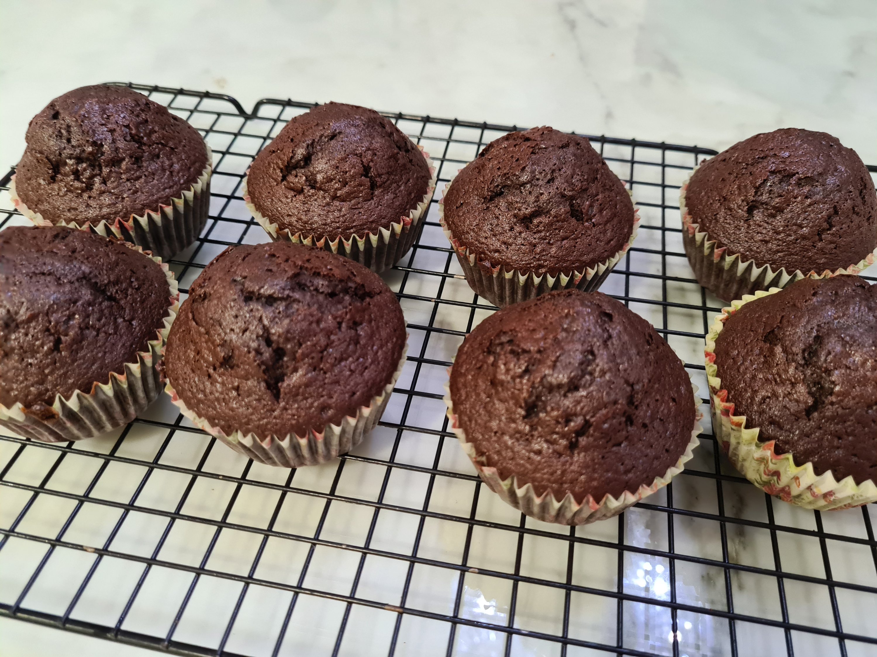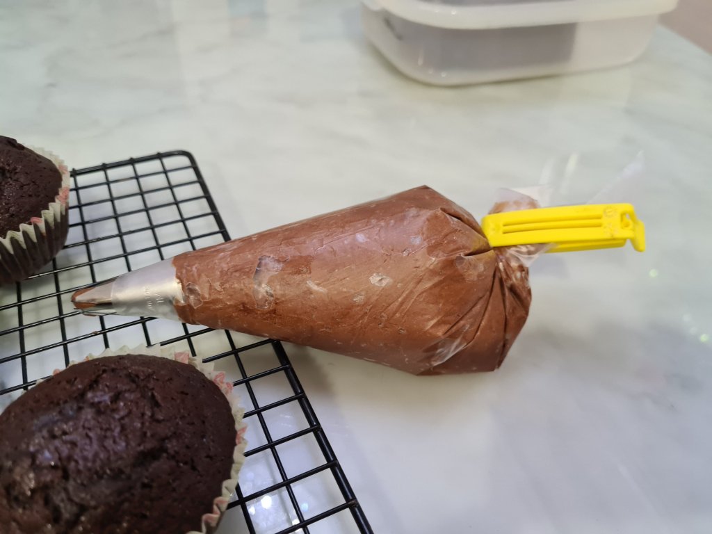 6. Pour into cup cake tin lined with paper liner or cups, fill up to 2/3 to 3/4 height into 12 cups, and bake at 165 deg C with fan for 15 to 20 min.