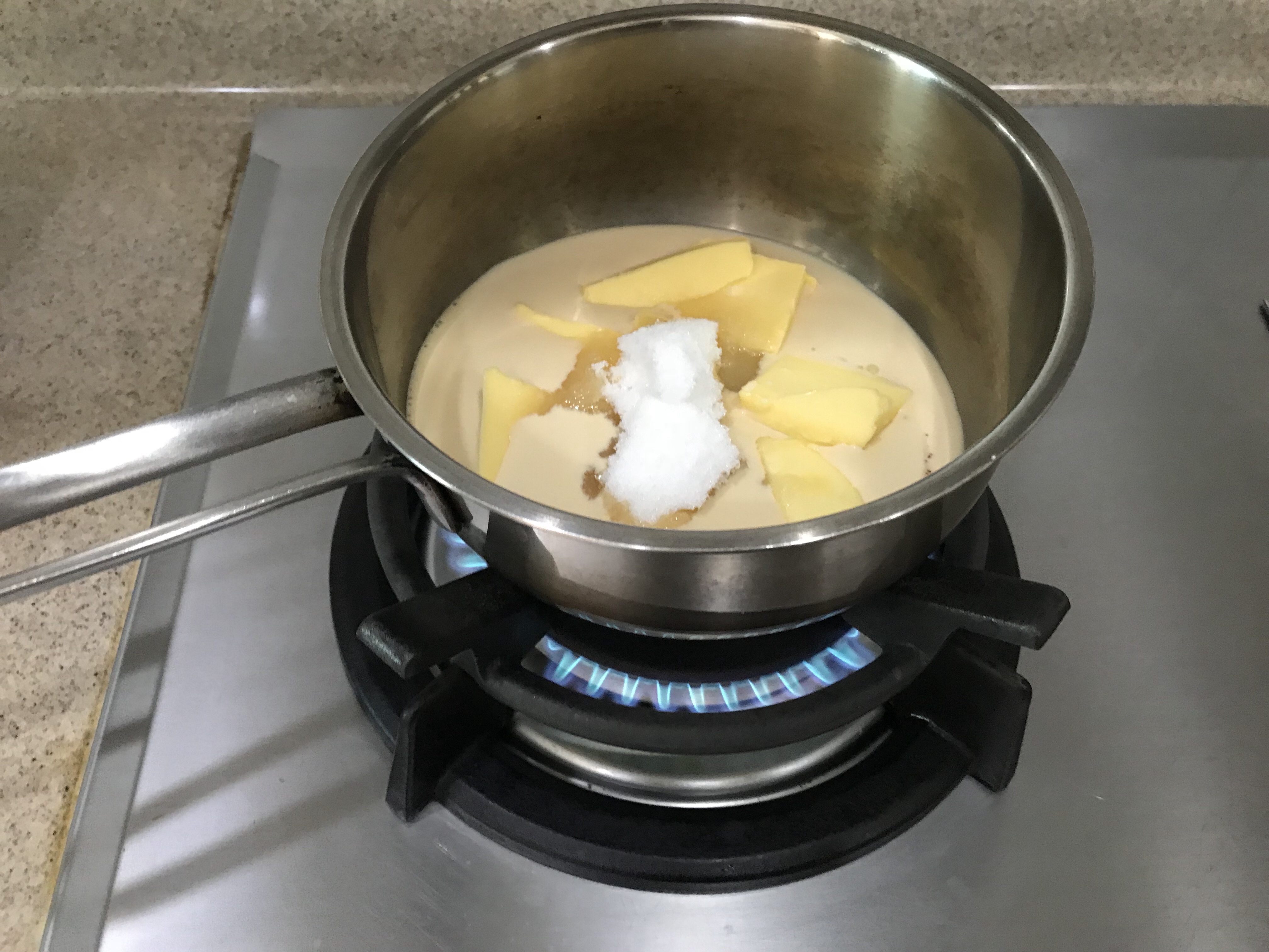 2. Place evaporated milk, sugar, salt and butter (or oil) in a pot and heat gently on low flames. Hand whisk till butter and sugar have all melted.