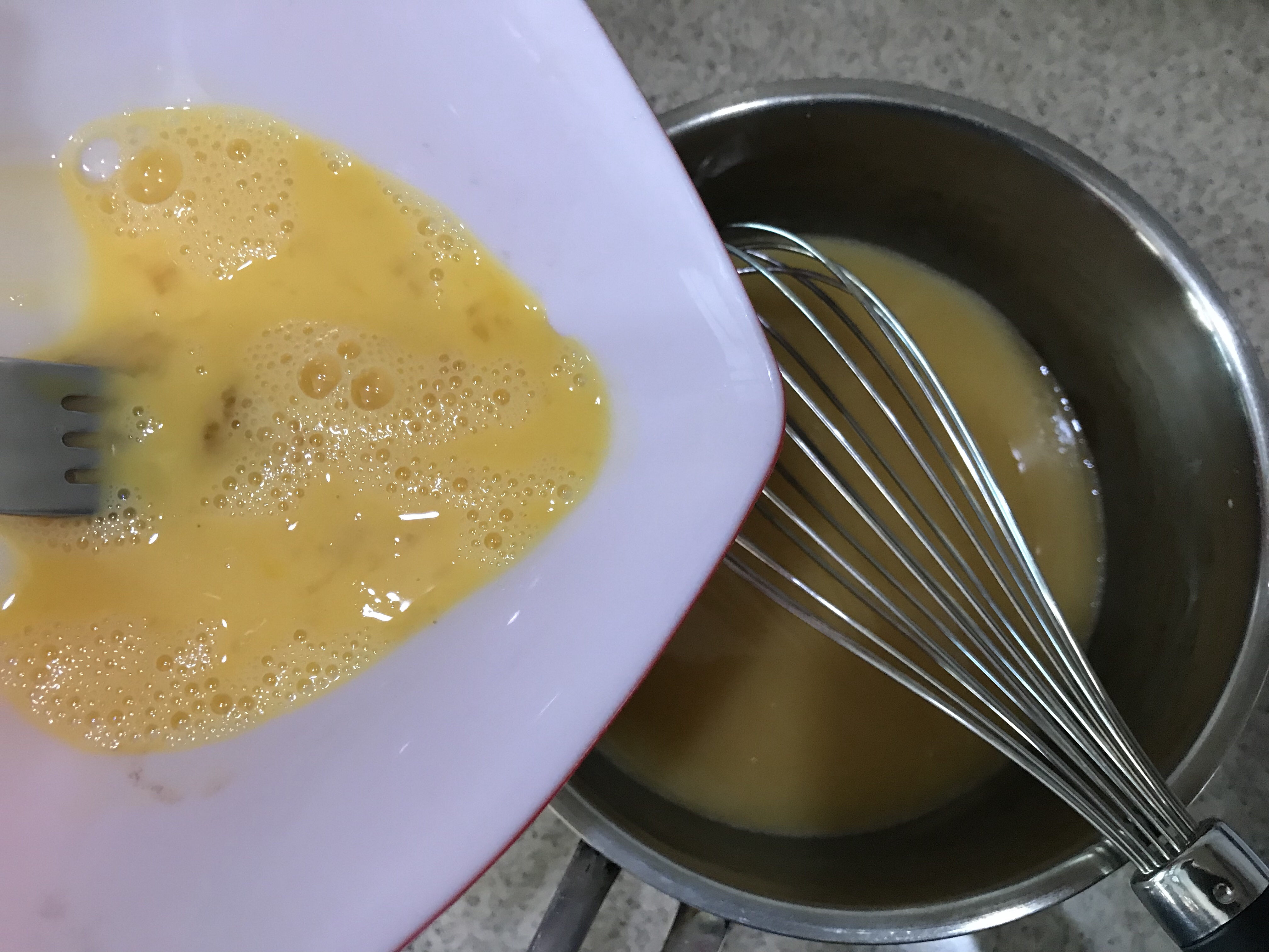 4. Beat the egg slightly and pour it in. Hand whisk till well mixed.