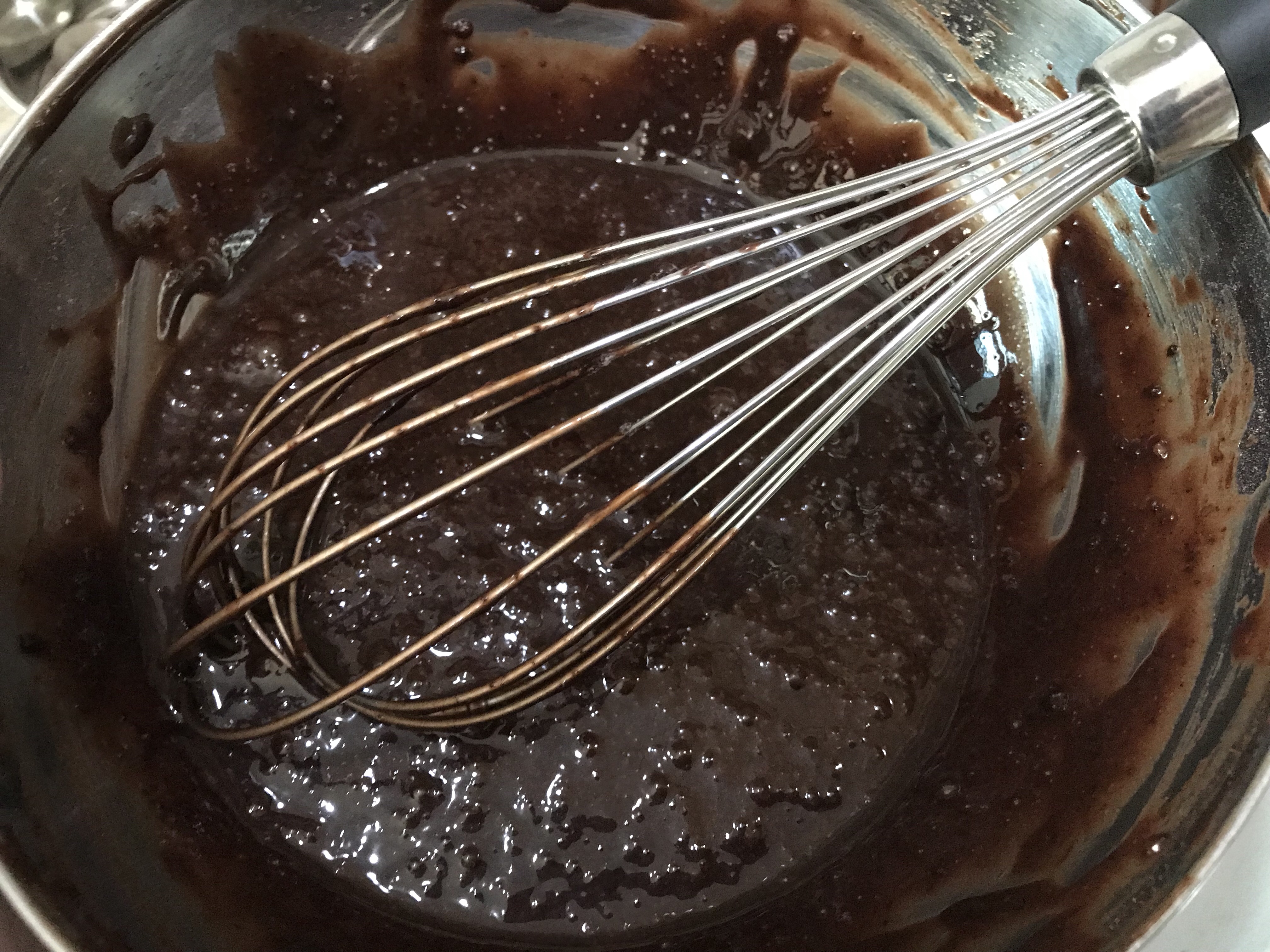 8. Pour into the bowl of chocolate and let it seat for 30 sec, then stir with a butter knife. If necessary, you can zap in microwave in short bursts of 5 sec to make the chocolate melt further.