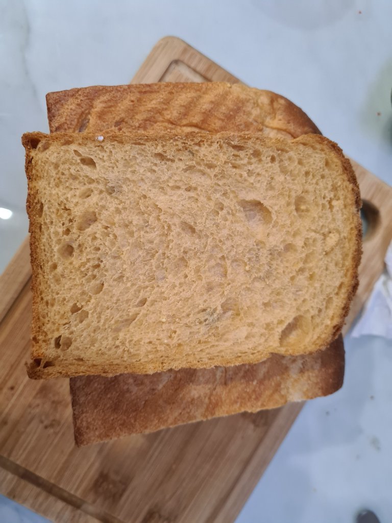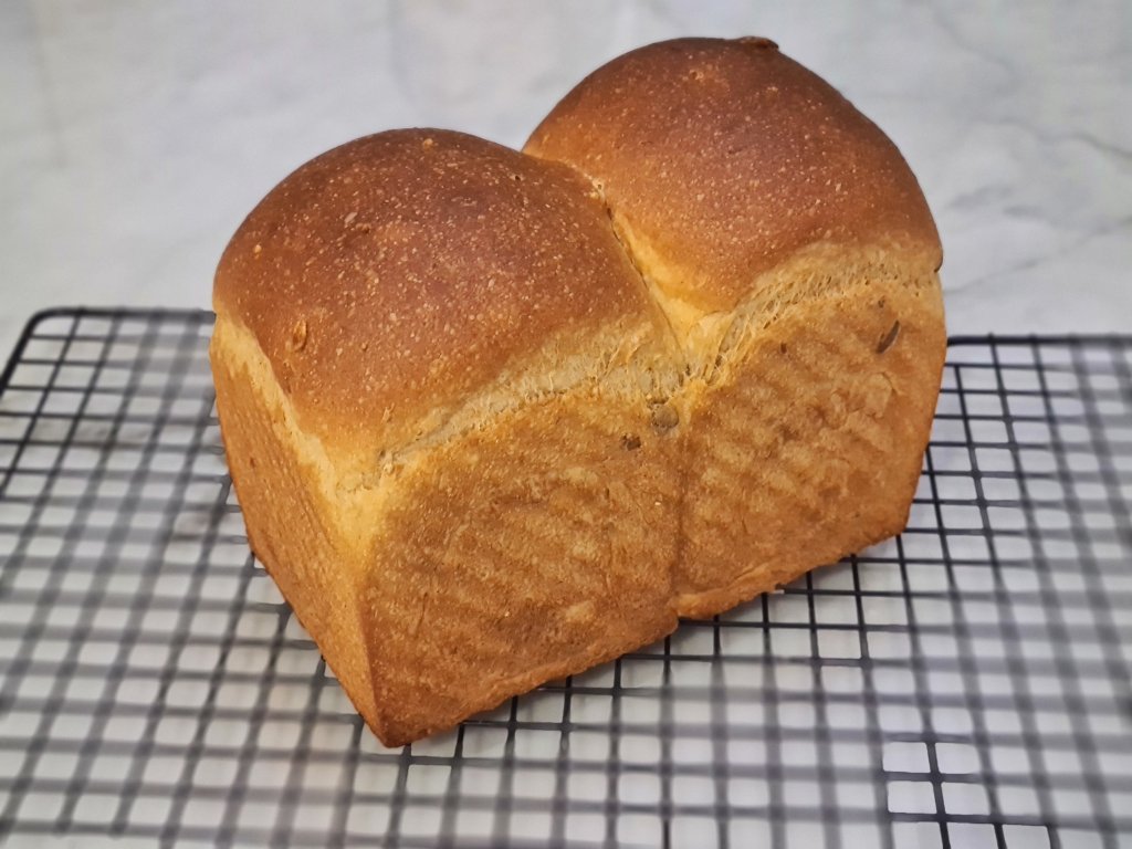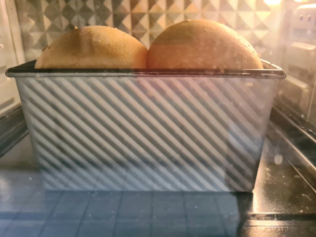 8. Place in Pullman tin and proof 1 hour. Bake at 30-35 min at 200 deg C. Tent the top if it gets too dark.