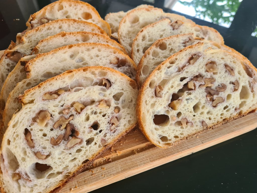 2. Do 1 to 2 stretch and fold and some kneading to ensure all flours bits are mixed in every 20 to 30 min. After 1 hour from mixing, do 1 lamination to add in walnuts.