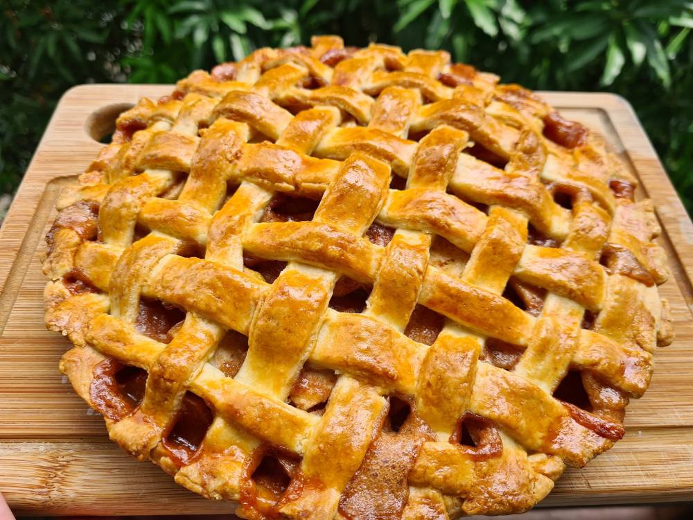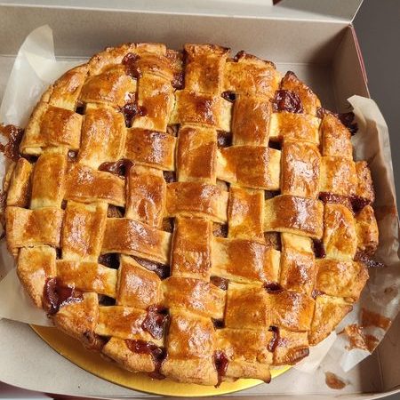 Fresh hand cut apples cooked in butter & dark brown sugar roux spiced with cinnamon, encased in an all French butter crust made from scratch. This is a big pie about 1.2 kg and not too sweet at all.