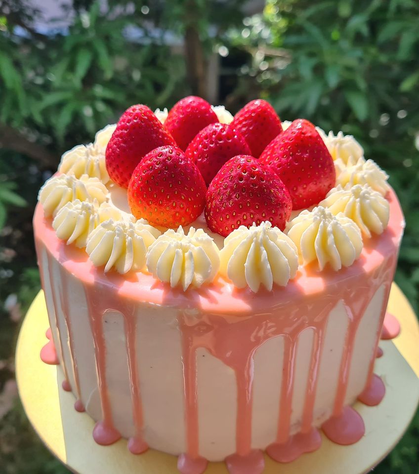 Generous amounts of US strawberries within 3 layers of vanilla sponge and frosted with French butter cream, topped with more strawberries. No non-dairy fresh cream, no trans-fat.