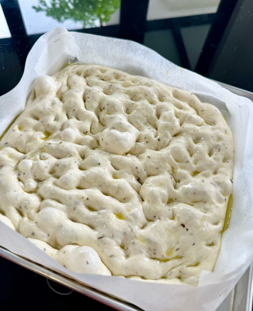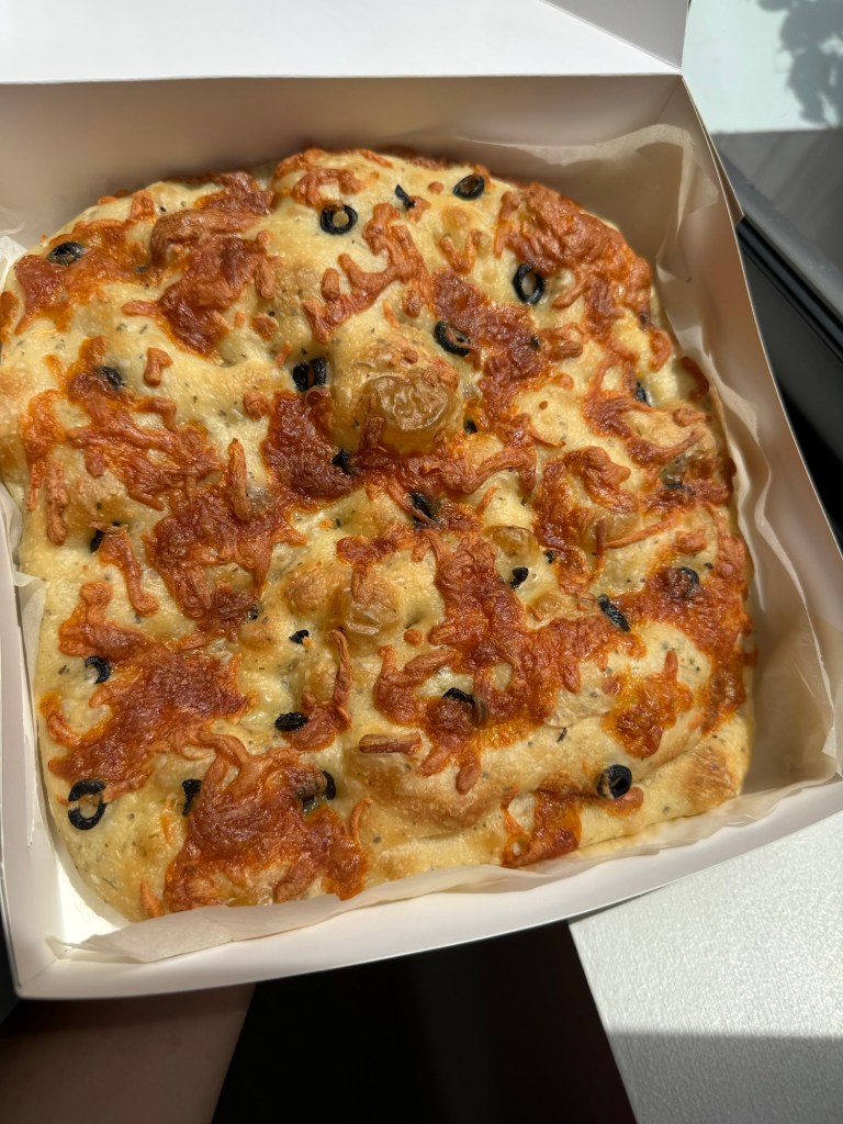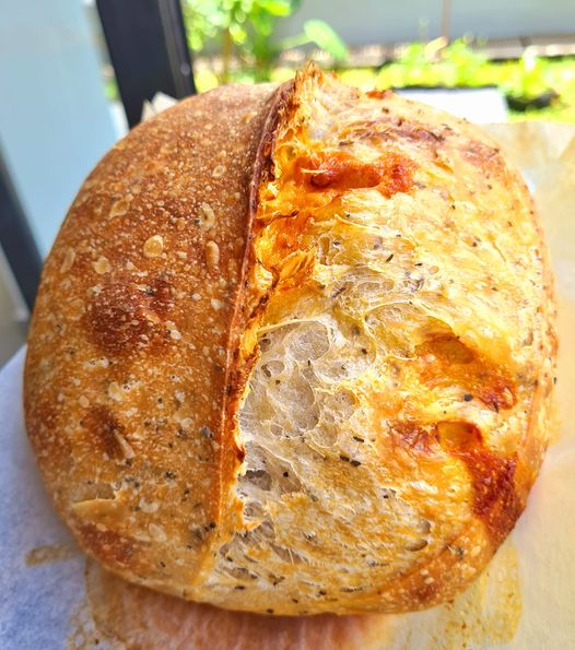 Pure sourdough infused with mixed herbs and extra virgin olive oil. Proofed twice totalling 7 hours plus overnight fermentation to create great flavour and texture. About 10 inch by 10 inch.