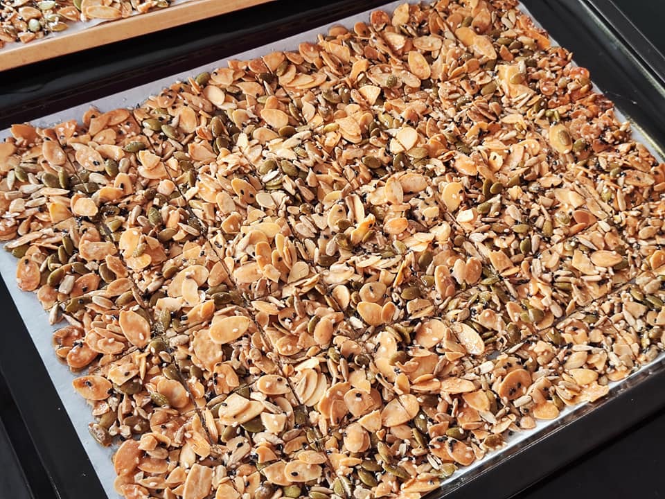 Mix of seeds and nuts including pumpkin seeds, black and white sesames, almonds and sunflower seeds. High ratio of nuts and seeds to florentine flour. Irregular shape, approx 200g.